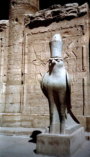 , divinità raffigurata in sembianza di falco. Il tempio ha la caratteristica, comune a molti edifici cultuali, di restringersi procedendo verso l'interno. Accorgimento che aveva lo scopo di creare una sorta di effetto cannocchiale, permettendo ai sacerdoti, dediti nella parte più riposta del tempio ai sacri riti, di poter comodamente osservare gli avvenimenti esterni al riparo da sguardi indiscreti. Di epoca tolemaica, ornato con decorazioni a carattere religioso e mitologico,
